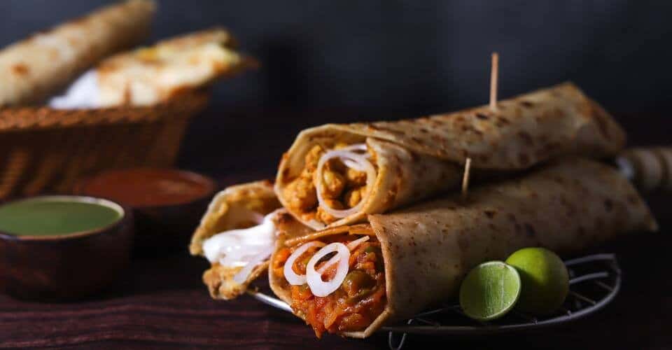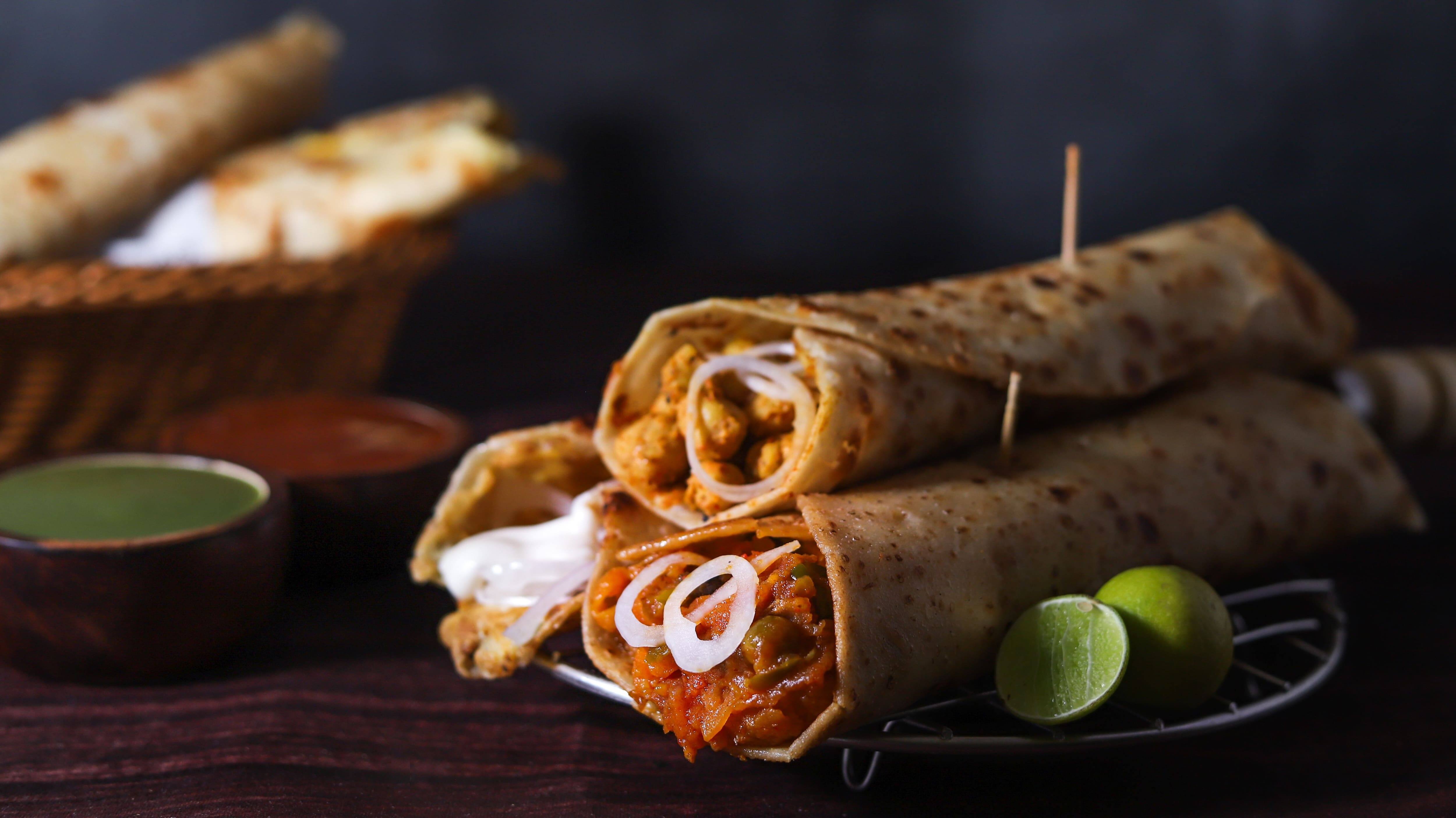 - Make four portions and put one in each roti or paratha, rolling it up to form the kathi kebab.