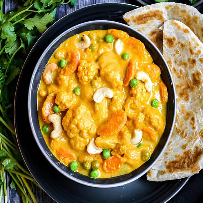 This curry packs in three different vegetables, giving you a good mix of vitamins and fiber. Cauliflower provides vitamin C and folate, while okra adds potassium and antioxidants. Potatoes offer energy and more potassium. The yogurt contributes protein and calcium, and the almonds add healthy fats and vitamin E.