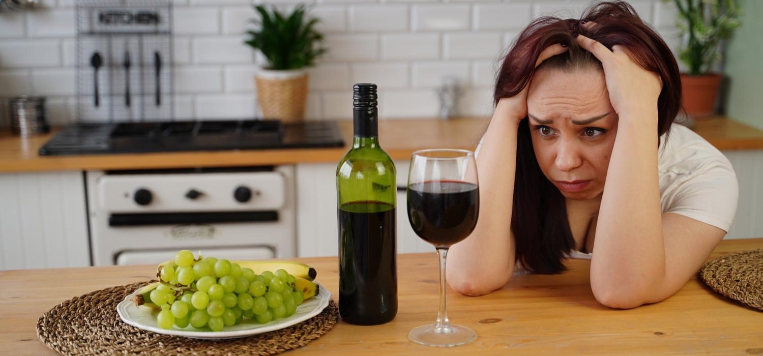 A woman sitting at a table with a bottle and glass of red wine holding her head in discomfort as she experiences a hangover