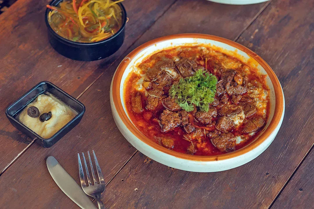 The lamb simmers long enough to become soft without falling into shreds, and the vegetables stay firm enough to hold their shape on the plate. The yogurt sauce adds a mild tang that balances the richness of the meat without making the dish feel heavy. The egg topping bakes into a firm layer that you can slice through cleanly, which makes serving easier.